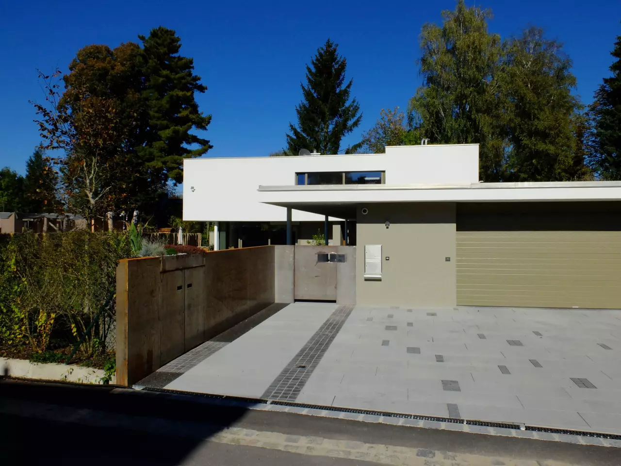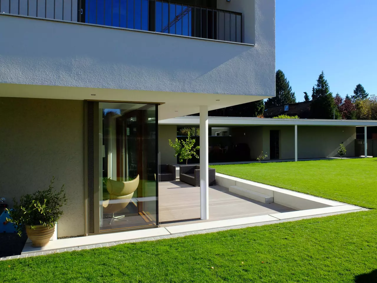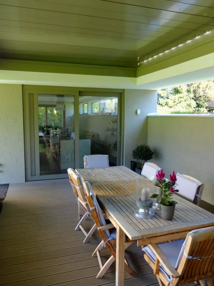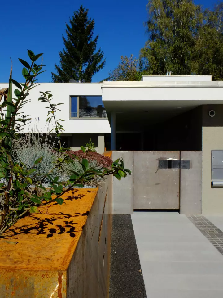 Durch die winkelförmige Baukörperanordnung vom Wohnhaus und vorgelagerten Garage, die mit einer langen gedeckten Erschließung bis zur Haustüre miteinander verbunden ist, entsteht ein geschützter atriumartiger Terrassen- und Außenessbereich.