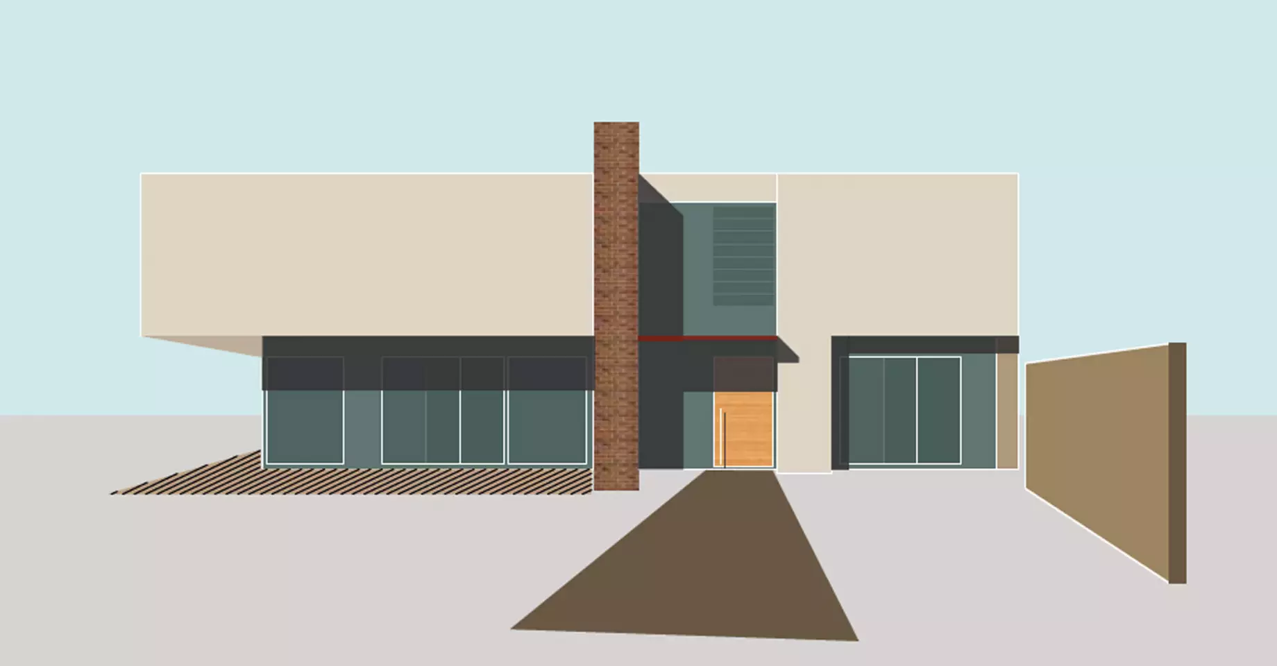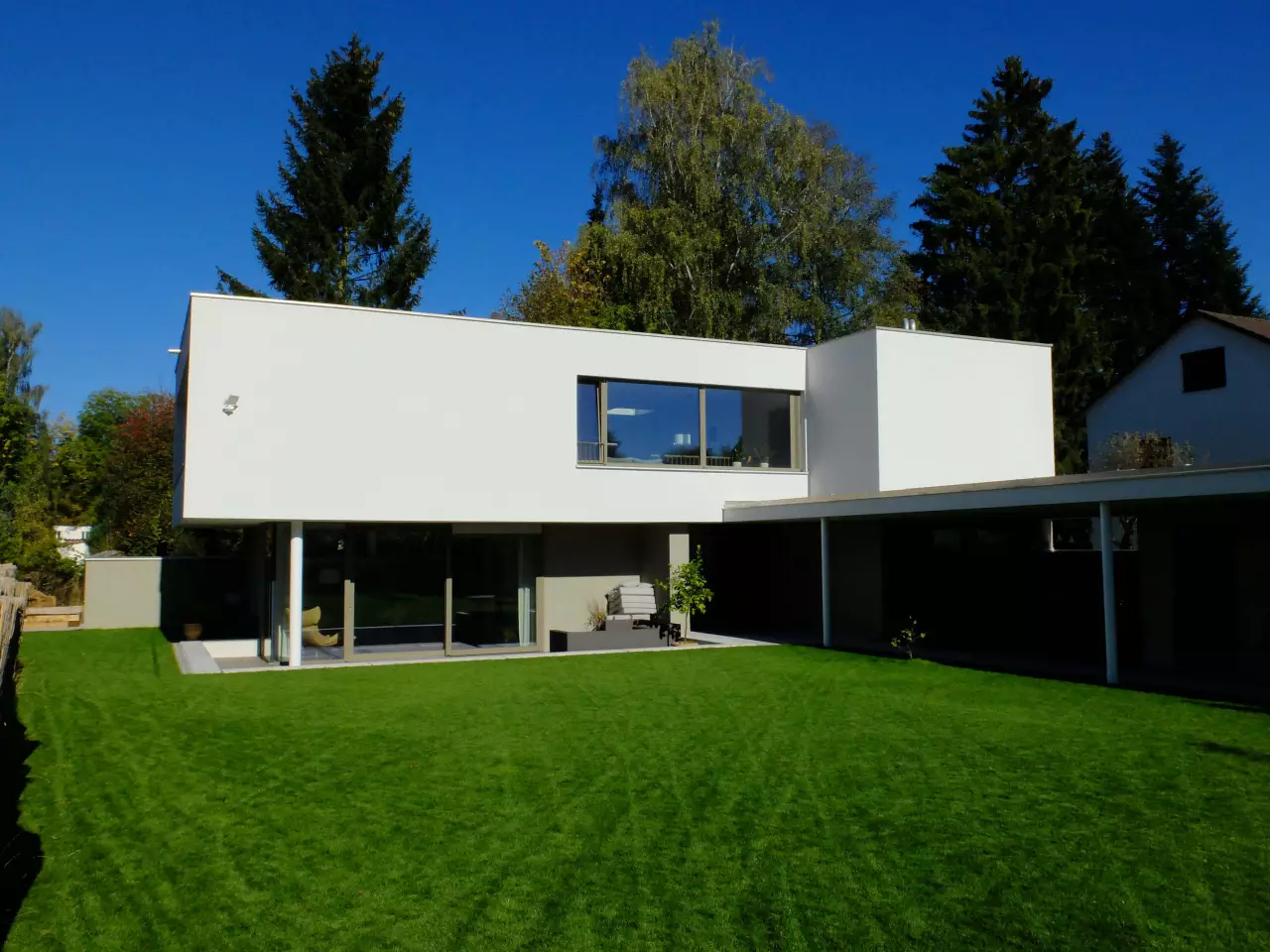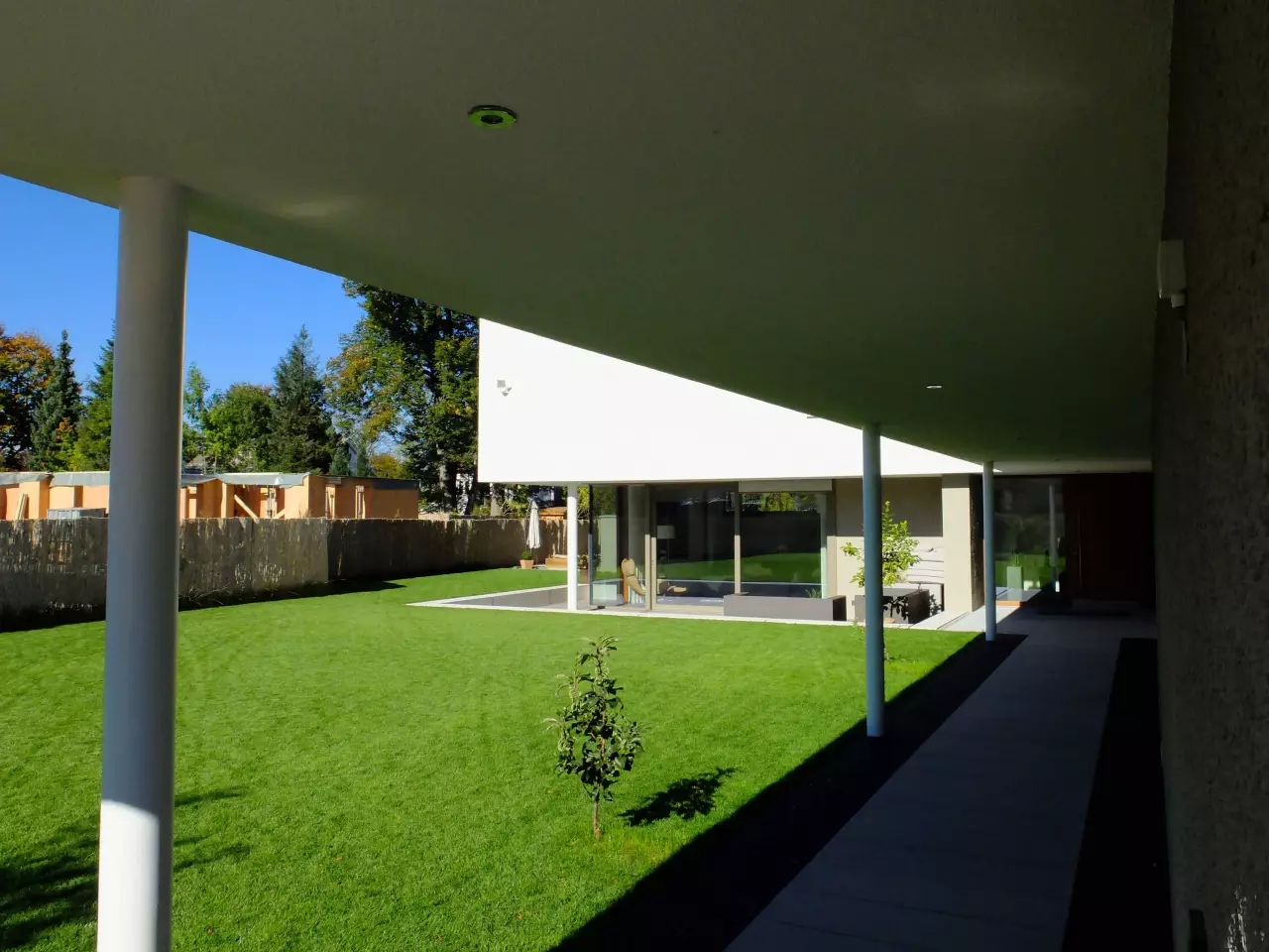 Durch die winkelförmige Baukörperanordnung vom Wohnhaus und vorgelagerten Garage, die mit einer langen gedeckten Erschließung bis zur Haustüre miteinander verbunden ist, entsteht ein geschützter atriumartiger Terrassen- und Außenessbereich.