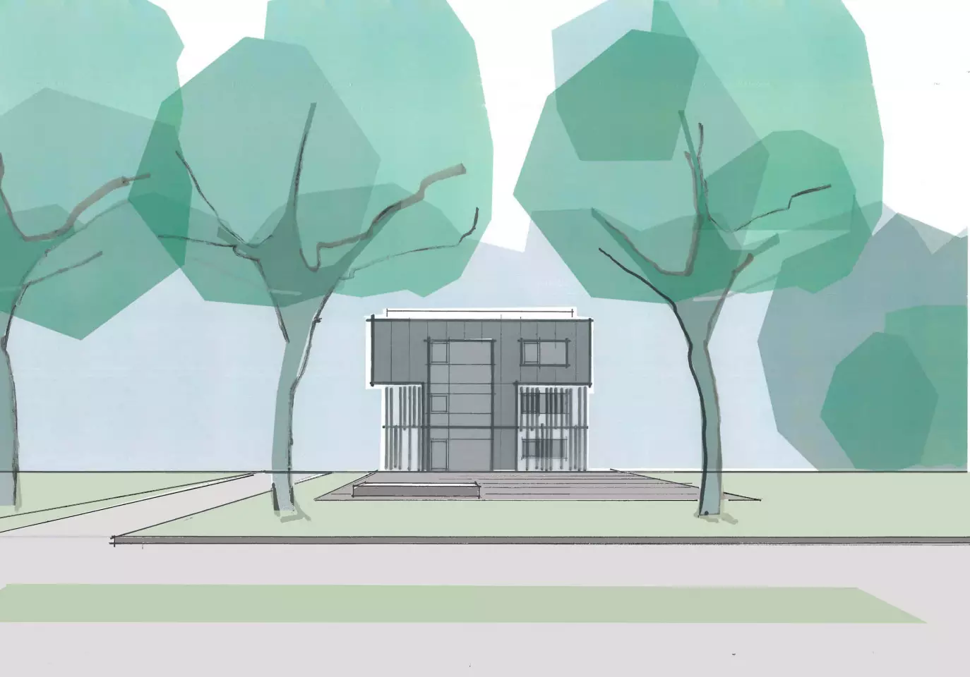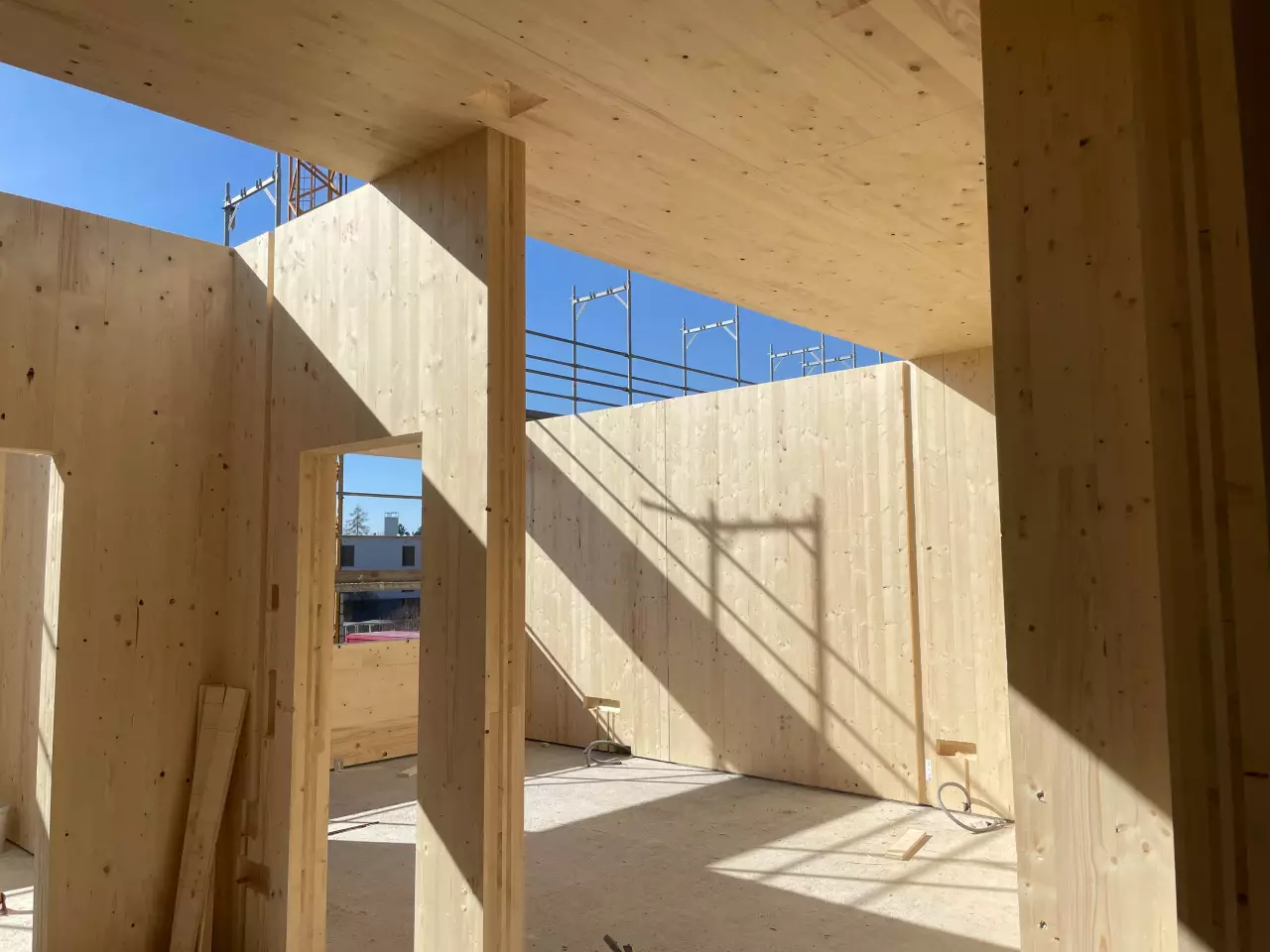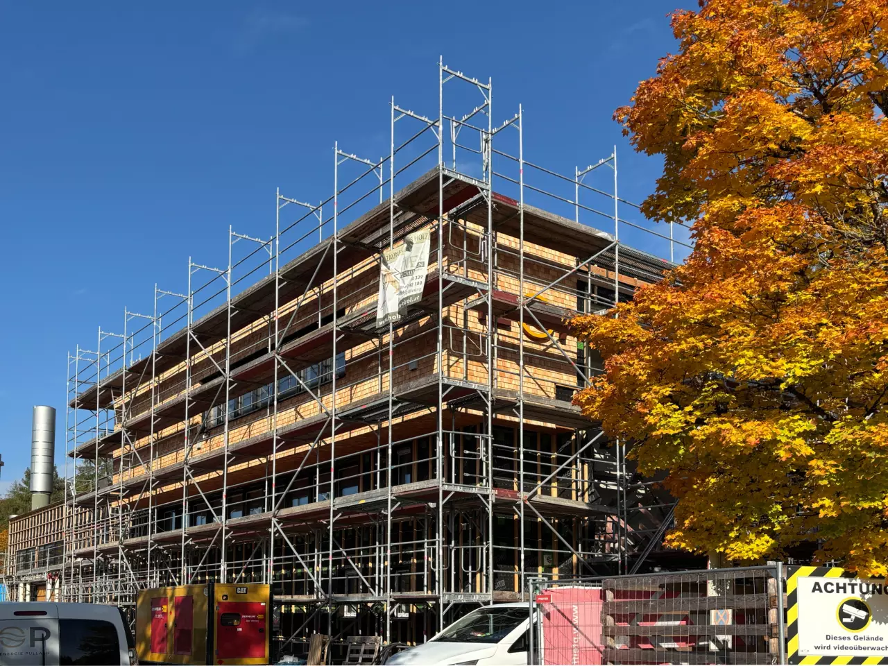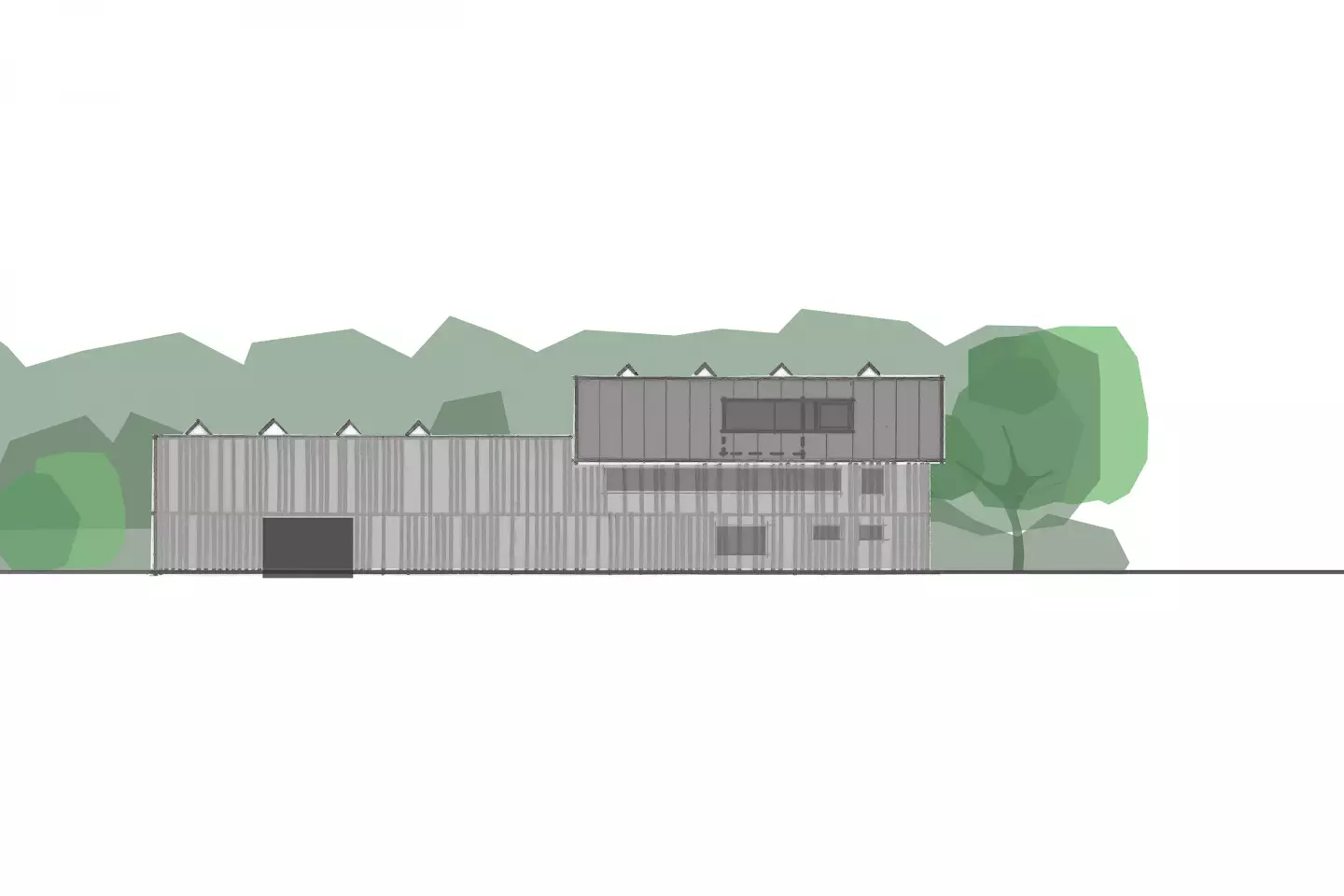 Das auskragende 2.Obergeschoss wurde als Massiv-Holzbau mit Schindelfassade ausgeführt. Das restliche Gebäude erhält eine begrünte Holzlamellenfassade.
