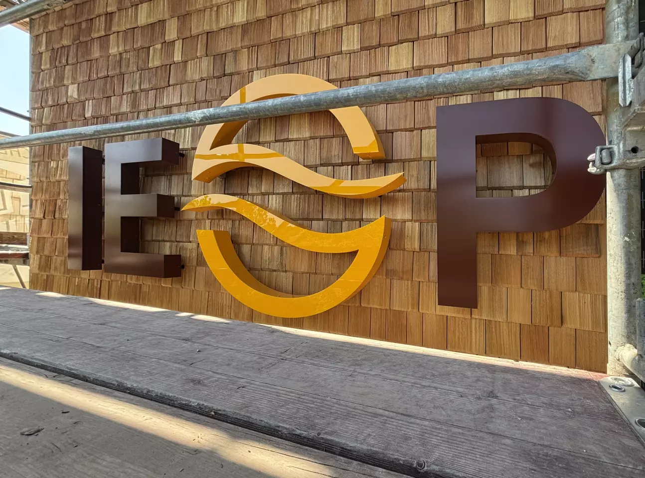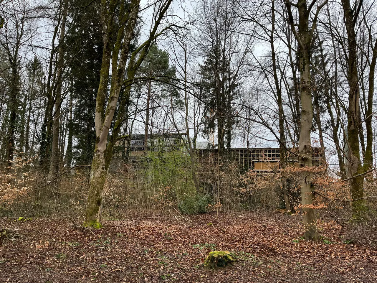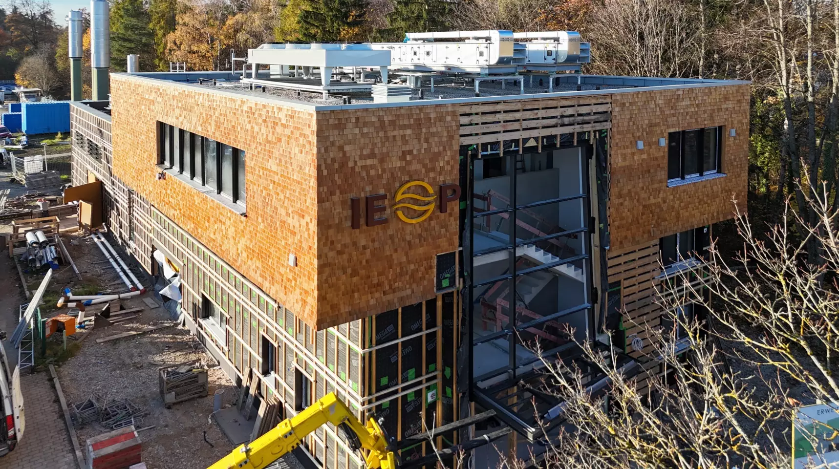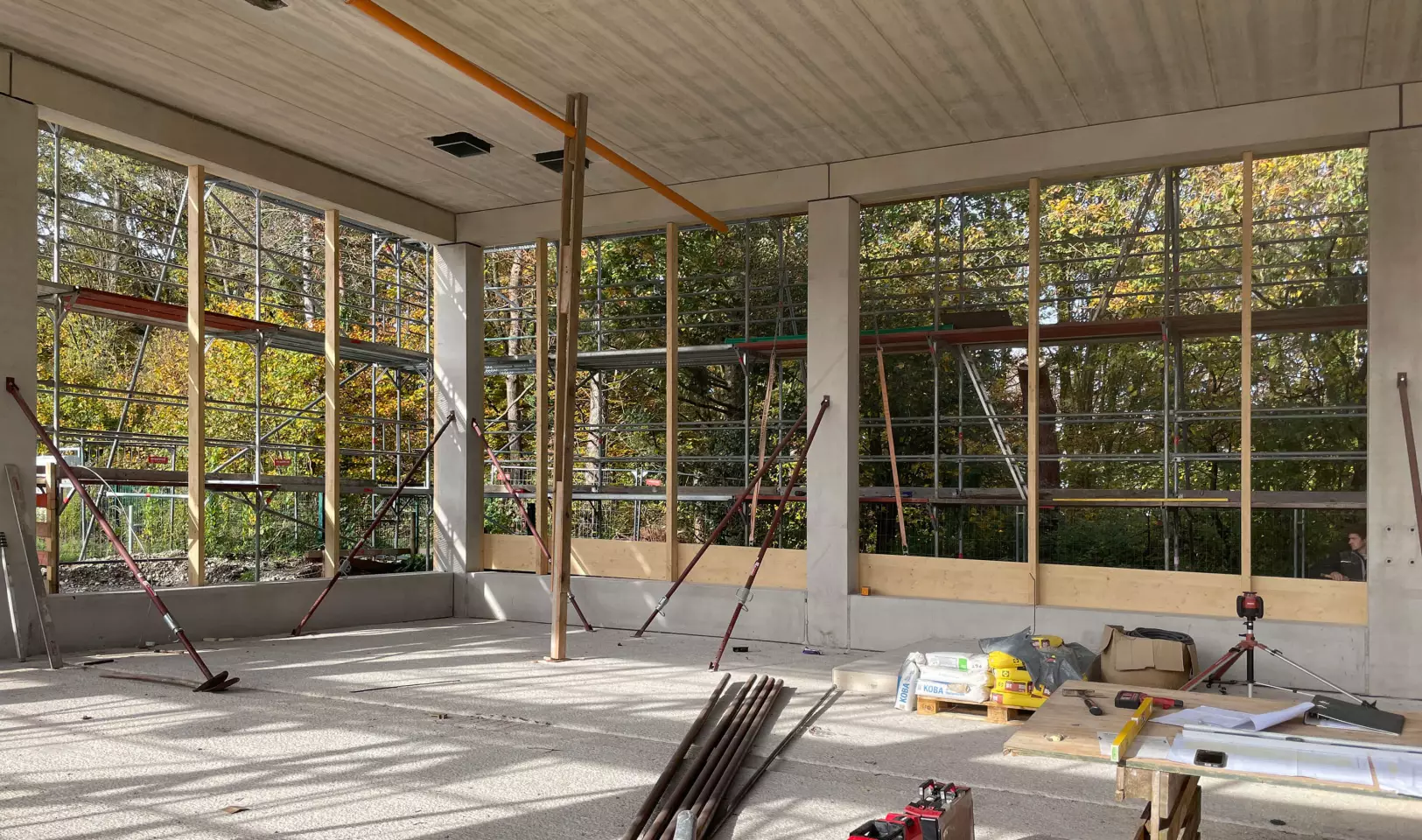 Das auskragende 2.Obergeschoss wurde als Massiv-Holzbau mit Schindelfassade ausgeführt. Das restliche Gebäude erhält eine begrünte Holzlamellenfassade.