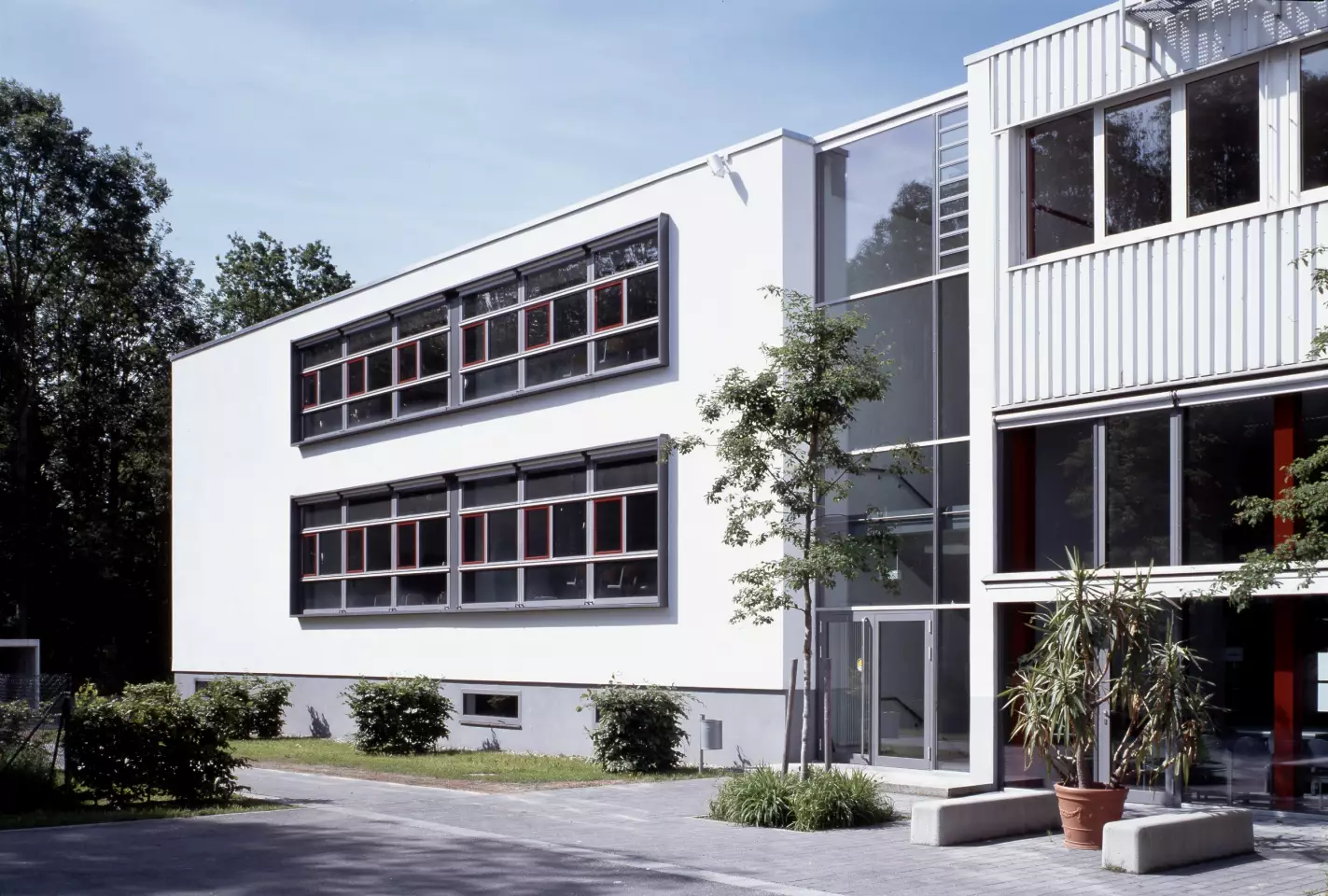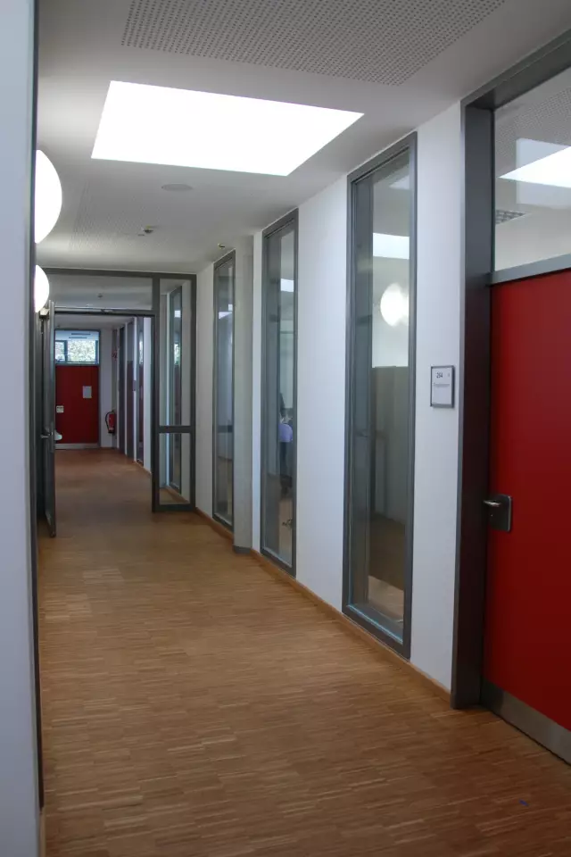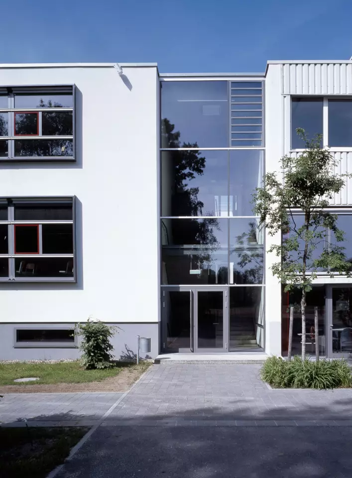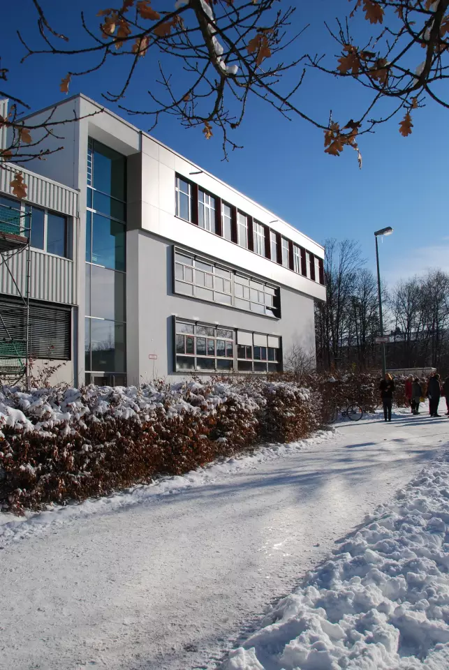 6 Jahre nach der Fertigstellung beginnt die Planung für die Aufstockung um ein weiteres Obergeschoss. Darin untergebracht ist der neue Oberstufentrakt mit variabel zusammenlegbaren Klassen und Seminarräumen.