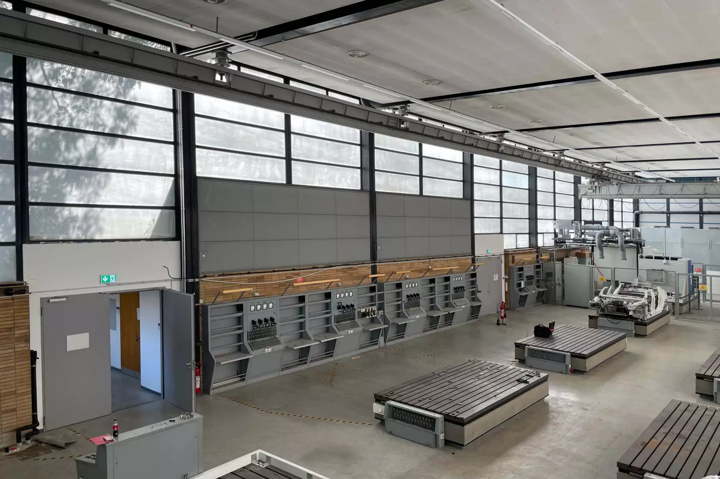 Neben dem großen Drohnen-Flugfeld entstehen auf Hallenebene die Werkstatt- und Vorbereitungsflächen. Darüber befinden sich die Lehrstuhl-Arbeitsplätze mit Besprechung und eine durch Netze geschützte Besuchergalerie. Sie ist trotz der strikten Trennung zu den sensiblen Lehrstuhlbereichen direkt über den neuen Fluchtweg an der Heßstrasse erreichbar.