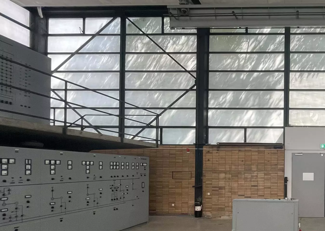 In sensiblem Umgang mit dem denkmalgeschützten Bestand werden auf zwei Ebenen von der Fassade leicht abgerückte Massivholzeinbauten als „box in box“ in die Halle gestellt. An den Berührungsstellen bleiben Alt und Neu als geschichtete Bauteile gut ablesbar. Die neuen Einbauten werden beheizt und mit Frischluft versorgt, die restliche Halle bleibt kalt.